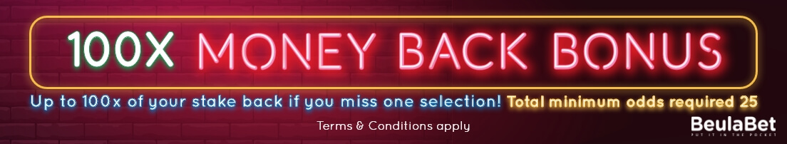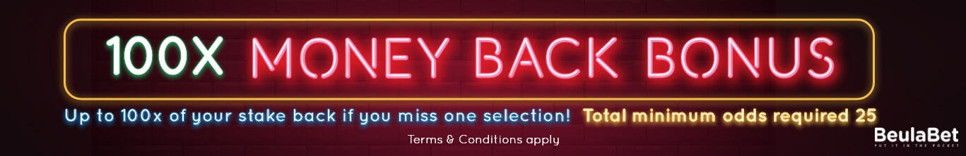 5. MONEY BACK BONUS is calculated on the winning selections left in your bet if only one (1) of your selections is a loser. For example, a 3-fold bet with accumulated odds of 120.00 that has one losing selection at odds of 2 will receive a bonus based on the 2 remaining winning selections odds of 60. Based on the MONEY BACK BONUS structure, this bet will receive a 2x stake MONEY BACK BONUS of 20.00 if your bet was 10.00.