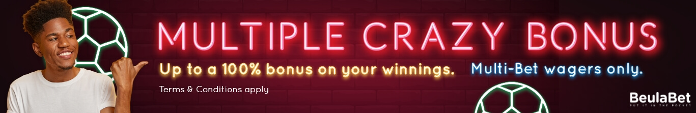 Place any multi-bet wager on a minimum 2 matches and odds of greater than 1.2 per selection and get a Crazy percentage boost on your winnings.